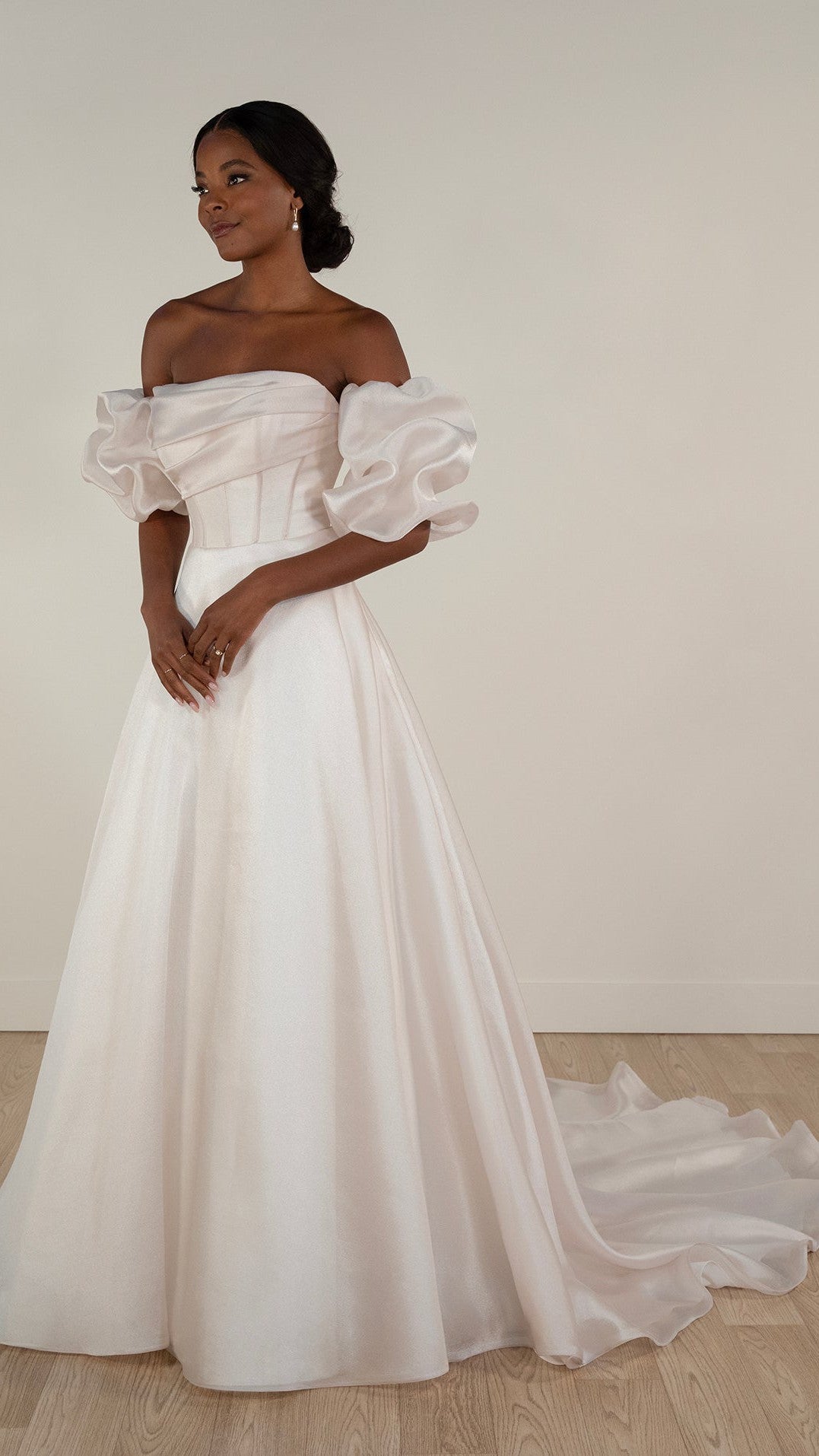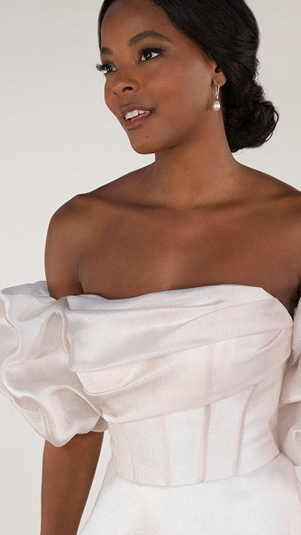 Style 7940 is an on-trend puffy sleeve wedding gown that exudes pure sophistication and cosmopolitan glamour. The pearl organza ballgown wedding dress features detachable off-the-shoulder puff sleeves that complement the length of the bodice—covering the mid-upper arm to the elbow. A gorgeously draped strapless bodice features a straight across neckline with structured corset boning to support the form and draw the eye to the natural hourglass figure. From the waist, the lustrous pearl organza floats into a romantic princess ballgown skirt, complete with discreet side pockets and a row of fabric-covered buttons down the back. This regal princess ballgown was made for bridal royalty. This wedding gown is also available in plus sizes.