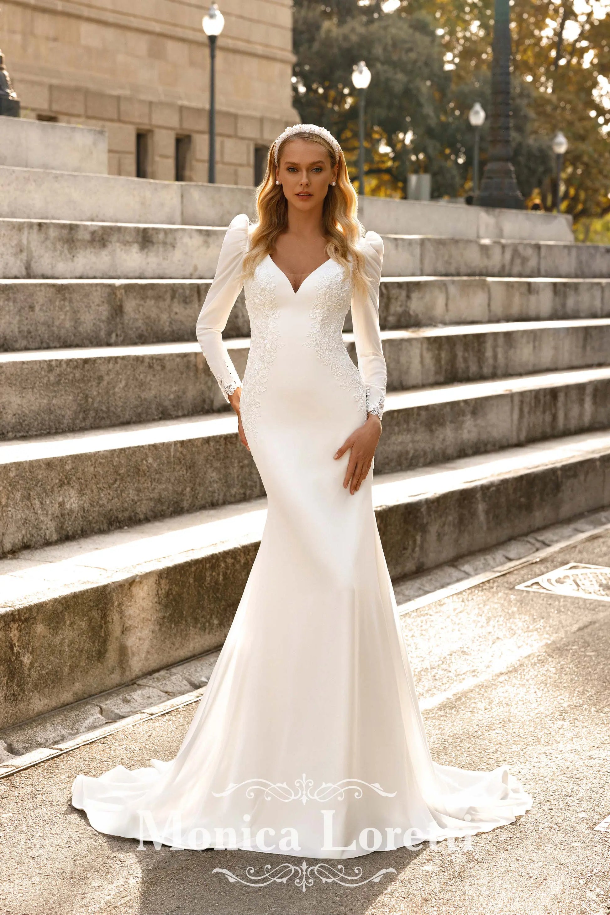 This fit and flare wedding dress is a masterpiece of elegance and allure. The crepe fabric creates a sleek and sophisticated silhouette, while the all-lace tattoo effect back adds a touch of drama and romance. The long sleeves are beautifully decorated with intricate lace elements, enhancing the overall charm of the gown. With its exquisite design and attention to detail, this dress is perfect for the bride who seeks a blend of modernity and timeless beauty on her special day.