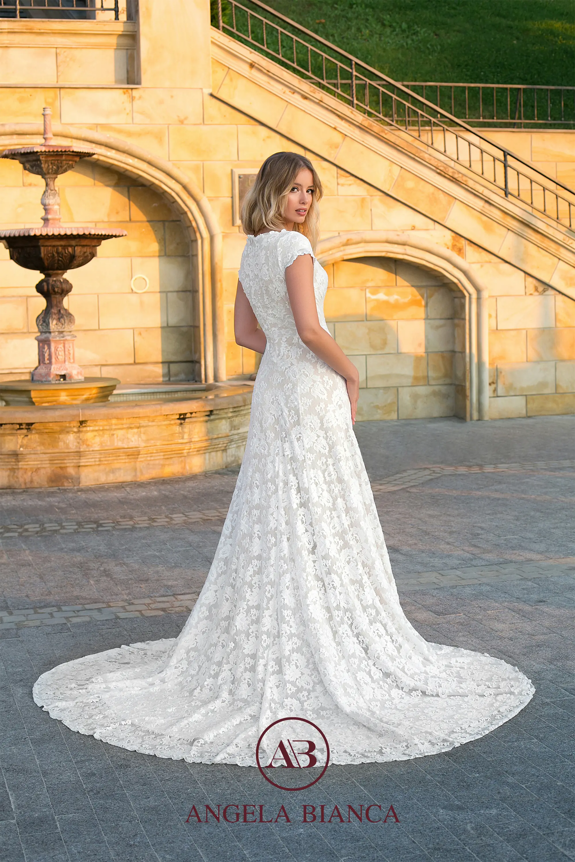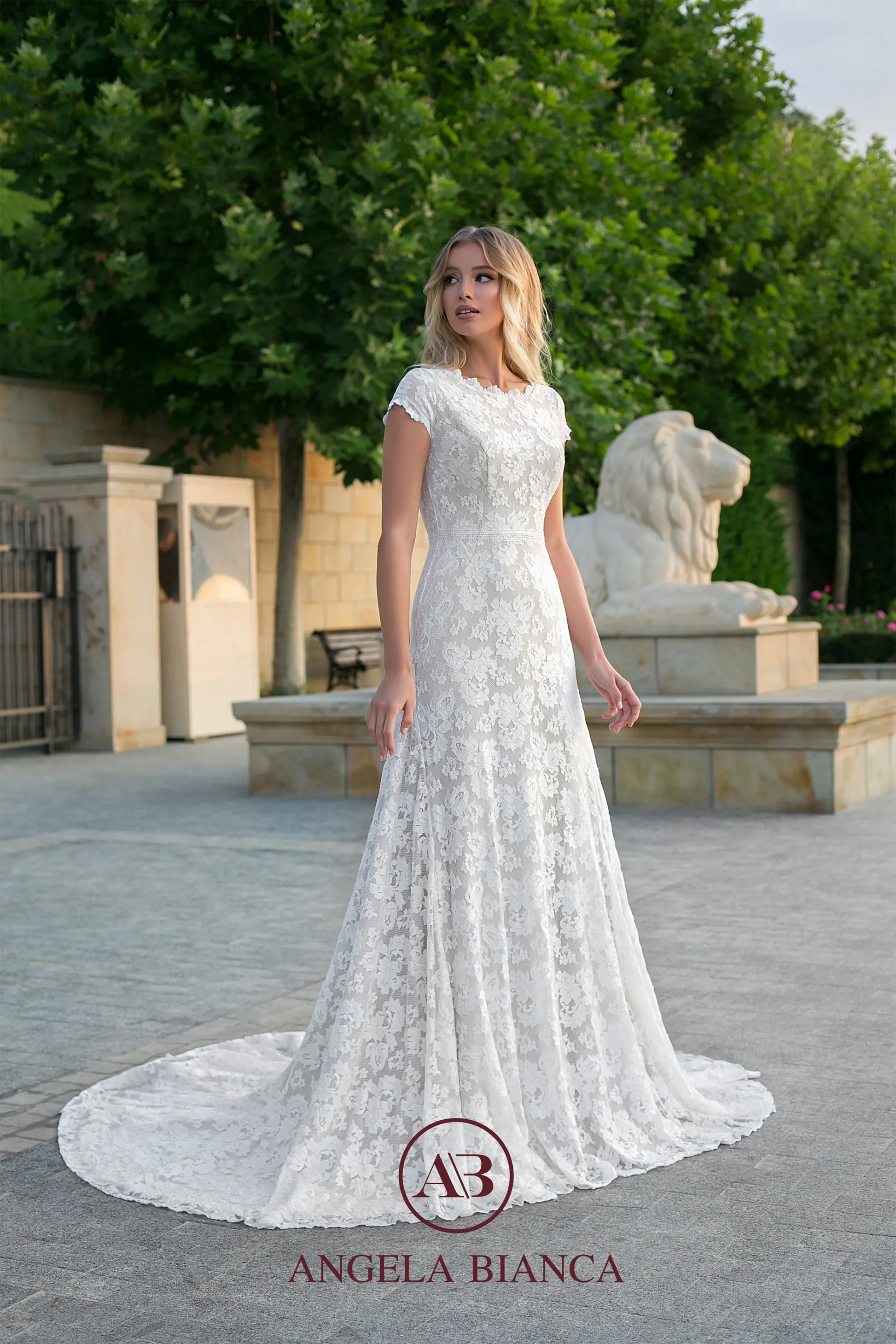 A-line dress in crepe covered with soft floral lace, absolutely enchants with its modesty. The sleeves and the neckline are trimmed with scalloped-edge lace and the waist is decorated with a delicate belt. Zipper closure and short train on the back.