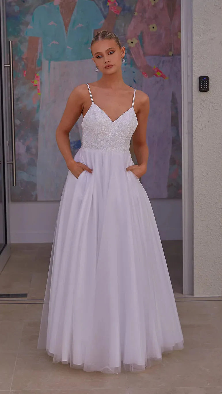 The A-line, lightly gathered tulle skirt not only exudes a sense of grace but also offers the convenience of side pockets, perfect for keeping your essentials close at hand. The inner bra cups and lightweight interlining ensure a comfortable fit, while the satin lining completes the dress with a smooth and luxurious feel.