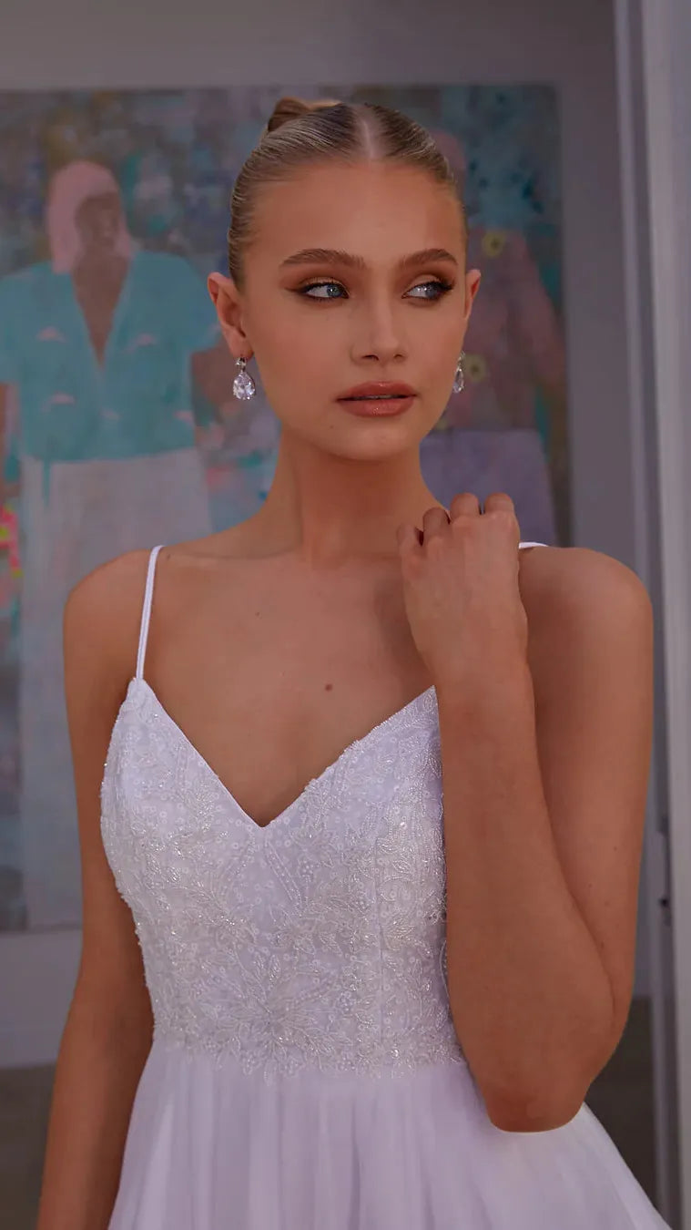 - Bodice hi cut v neckline with flat straps and a glass beaded bodice.