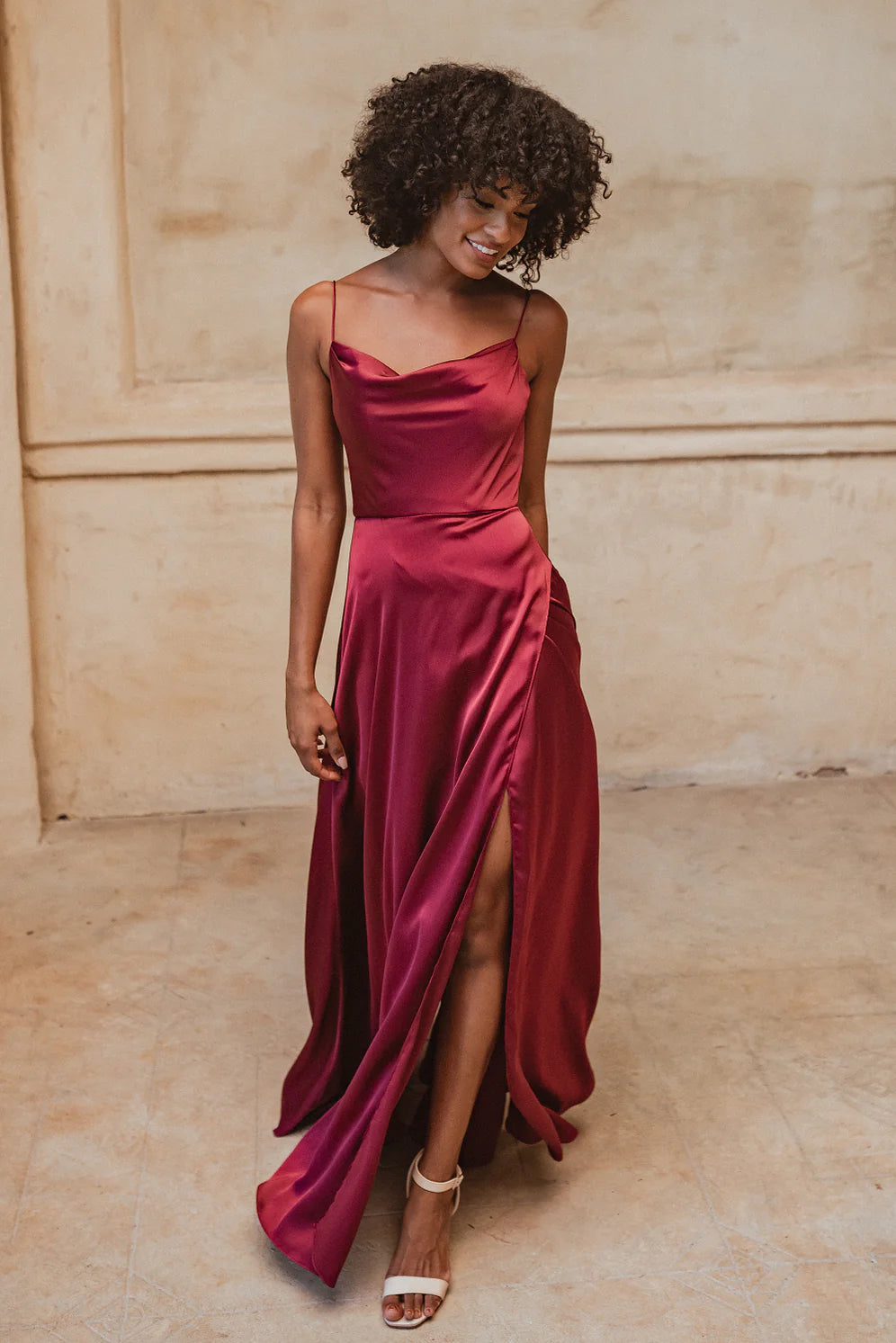 The Denver bridesmaid dress is a simple yet elegant design, that will take your breath away. The Denver features a slinky cowl neckline, spaghetti straps, and a gorgeous square shaped back. From the waistline falls a floor length skirt with a leg split that starts in the middle of the thigh and falls to a fit and flare silhouette. This design is constructed from a lightweight satin that sits beautifully on the body, and is a great choice for spring and summer affairs. This bridesmaid dress is available in 11 colours in sizes AU 4-30.