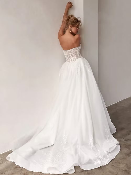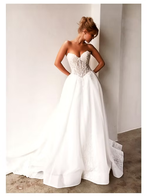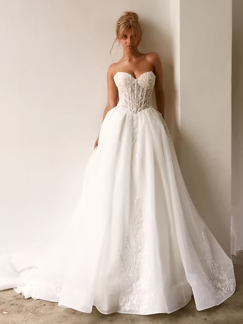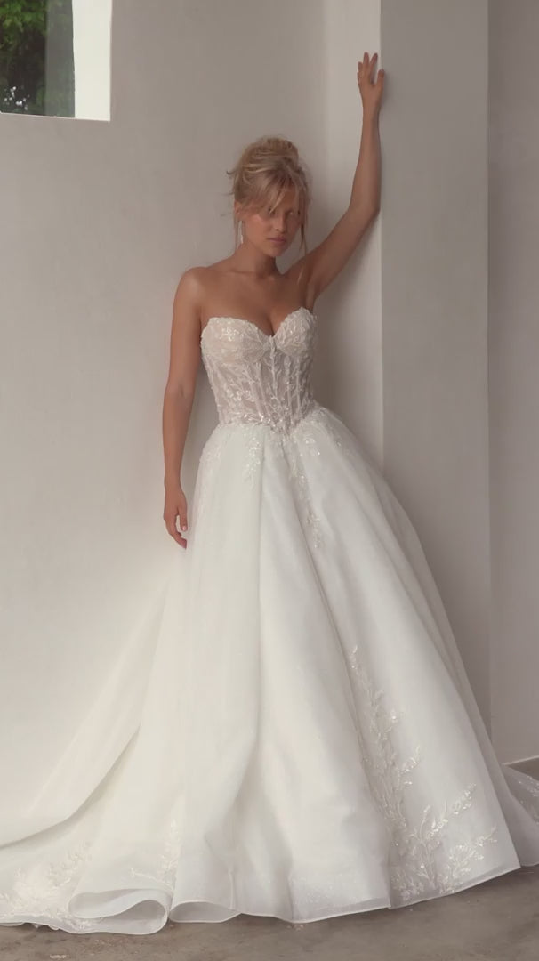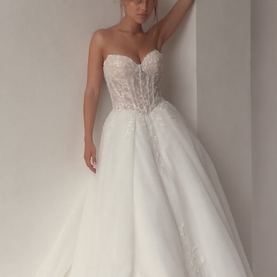 The Lux wedding dress is the modern princess gown. Featuring a classic strapless sweetheart dropped waist bodice finishing in a trendy dropped v front. The exposed boned corset is layered with a romantic combination organza, tulle and lace applique. The voluminous tulle skirt features deep knife pleats decorated in beaded lace applique.