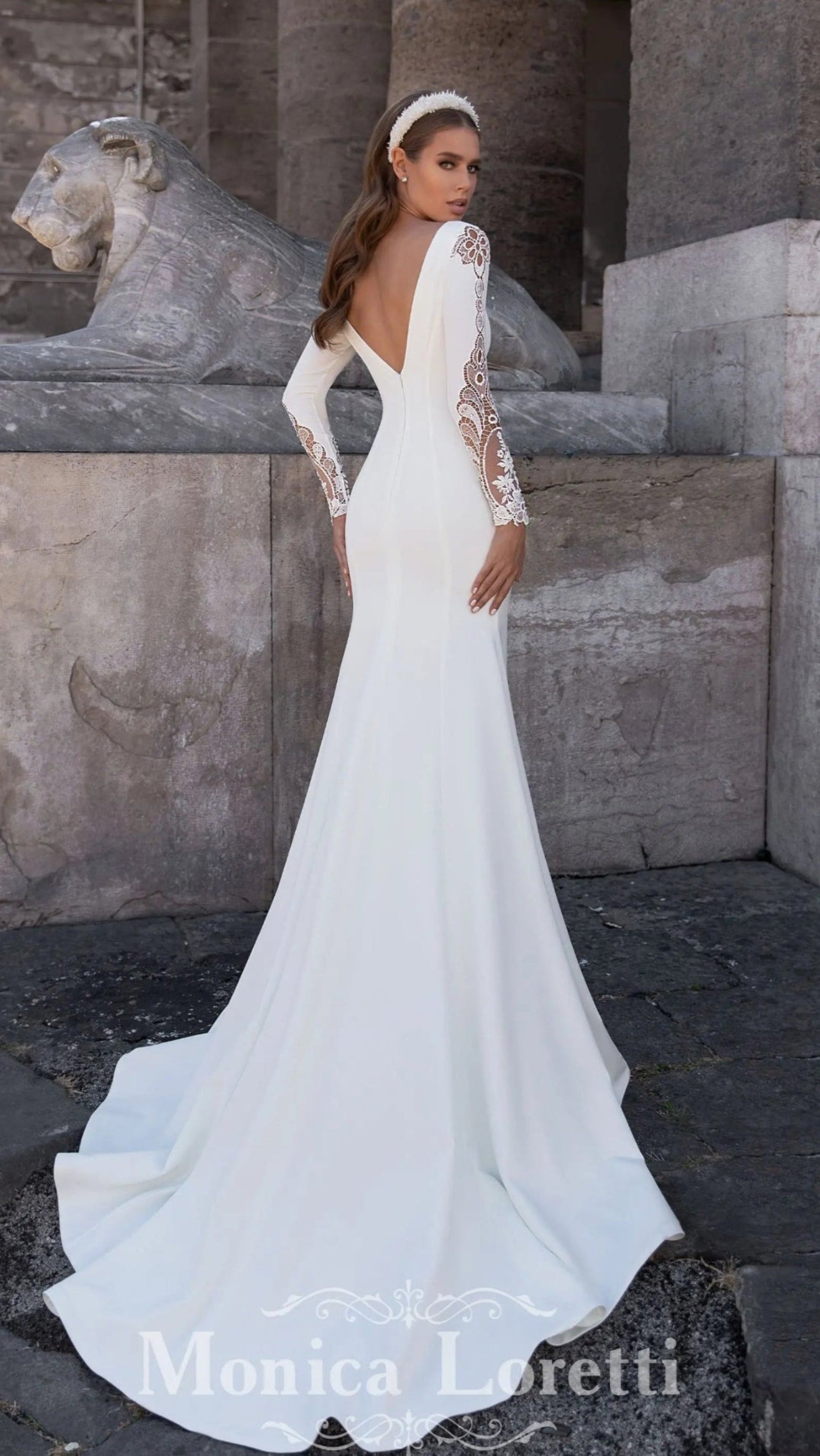 Elegant lace elements on the sleeves and tailored silhouette undoubtedly make this structured crepe gown stylish and remarkable. A plunging back and neckline lend an elegant vibe to this figure-flattering fit. It’s minimalism at its best.