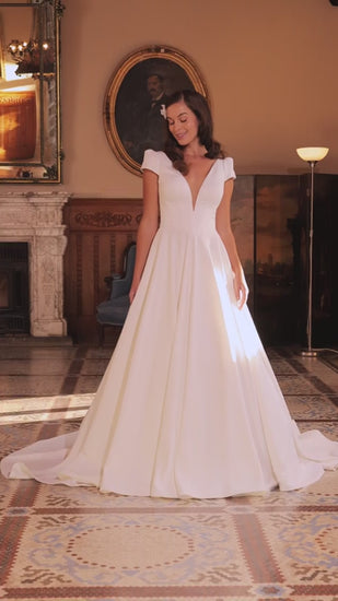 Embrace effortless elegance in this timeless wedding gown. Designed with a striking V-neckline and structured cap sleeves, this dress radiates sophistication. The flowing A-line skirt moves gracefully, while the open back adds a modern edge. A perfect choice for brides who appreciate refined minimalism with a regal touch. It can be made in matte satin, as in the photo, in mikado or jacquard.